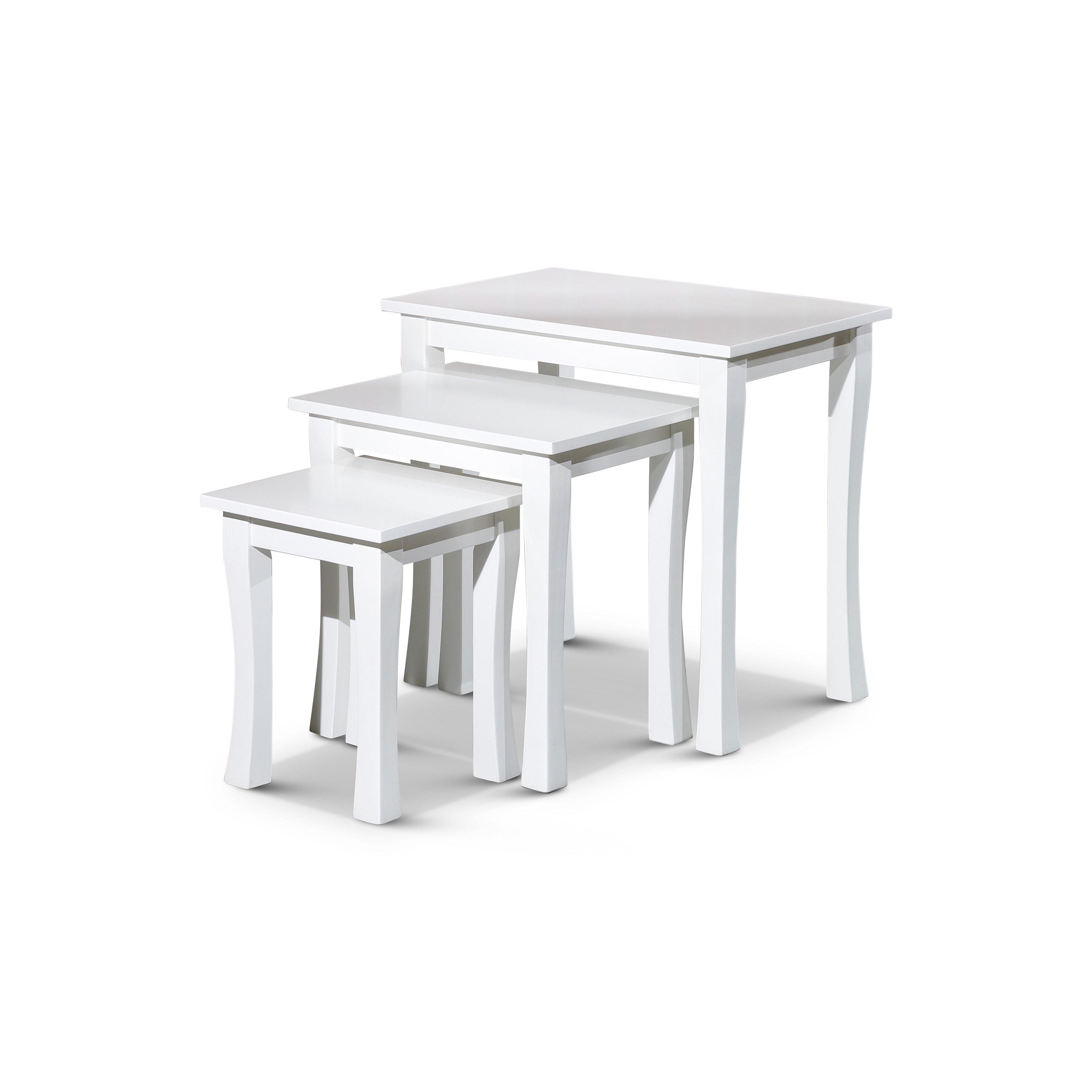 3-Piece Nesting Table Set, WhiteAdd a modern touch to your décor with this contemporary 3 piece nesting table set. These convenient nesting tables are a great way to add table space for entertaining. They can be placed around the room separately for a convenient place for guests to place drinks or can be stair stepped as a great way to display hors d'oeuvres. These hardwood tables feature a modern flared leg and a clean white finish.Nesting Table CollectionThese convenient nesting tables are a great way to add table space for entertaining. They can be placed around the room separately for a convenient place for guests to place drinks or can be stair-stepped as a great way to display hors d'oeuvres.The medium and small table stack completely under the large table or can be staggered to add extra display space. They are perfect for any room.DimensionsLarge Table: 23 in L x 15 in x 21 inMedium Table: 17.25 in L x 13.5 in W x 18 in HSmall Table: 11.75 in L x 11.75 in W x 14.75 in H