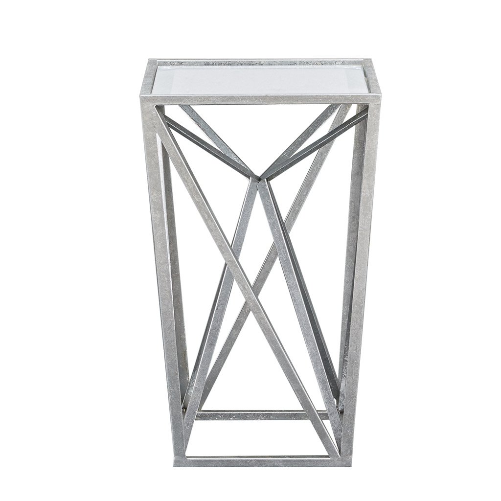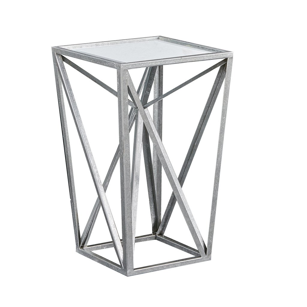 DescriptionThe Zee accent table brings elegance to any room with its modern angular shape. Featuring silver leaf finish and beveled glass tabletop, this end table is sure to shine in the living room. No assembly requiredProduct DetailsSee below1 Accent Table:12"W x 12"D x 20"HTop Frame:12"W x 12"D x 0.5"TMirror:10.75"W x 10.75"D x 0.2"TMaximum Weight Capacity:30LBSMaterialMirror top with metal base, MDF of mirror backTop Material: MirrorBase Material: MetalBase Finish: SilverTop Finish: Silver