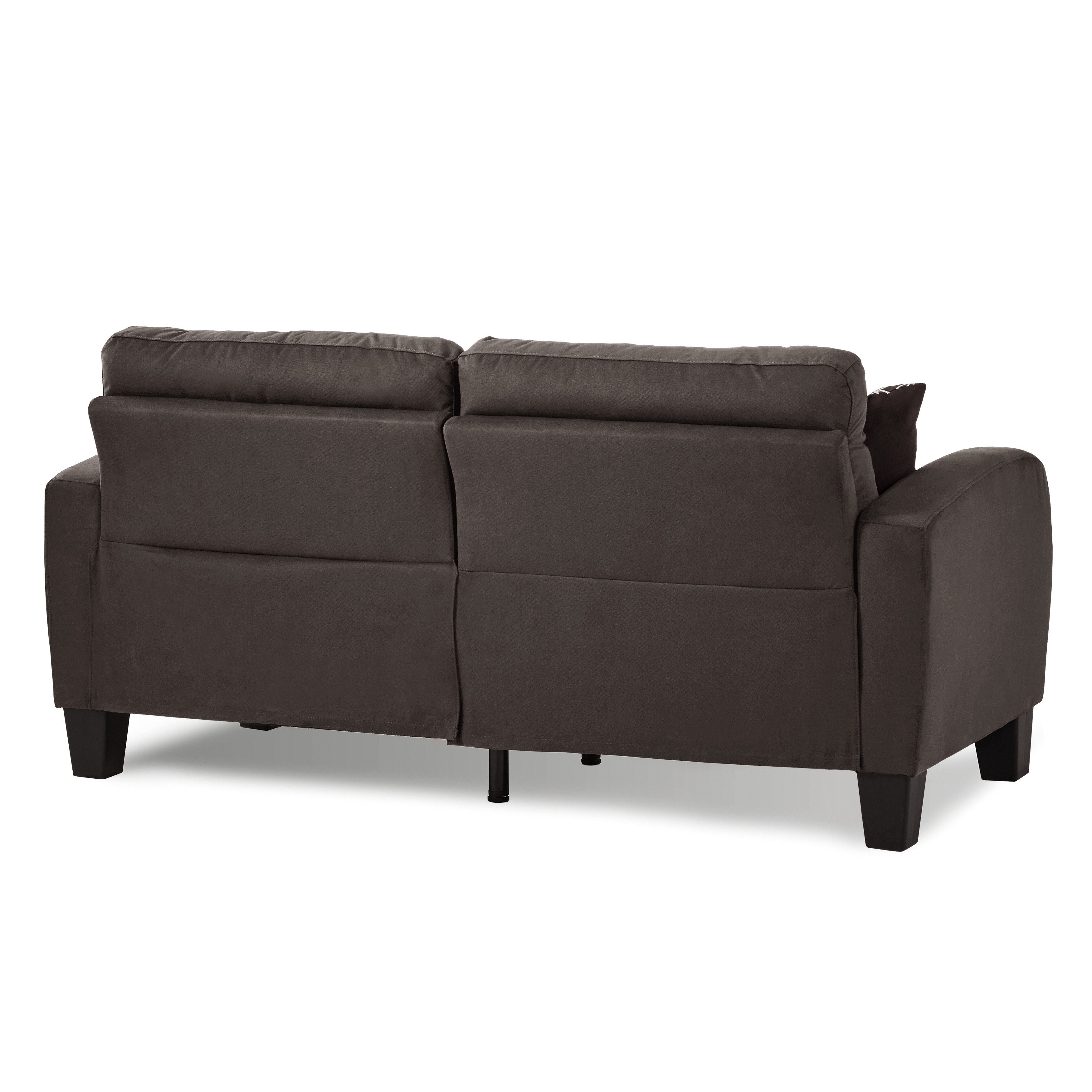 Description & DimensionsA hint of retro styling provides a clean and classic look for your contemporary home in the Sinclair Collection. The sofa allows for the perfect placement within your living room. Chocolate fabric with contrast pillows that furthers the look and versatility for placement within a number of home decors.PRODUCT DIMENSIONS: Overall Dimension: 72.25" x 32" x 35"HSeat Width: 61.5"Seat Depth: 21"Seat Height: 20"Arm height: 25"Pillow dimension: 16 x 16 (2)Doorway width: 17.25"Listing Includes: One Sofa Only.Loveseat & Chair: Not included.Simple Assembly Require.