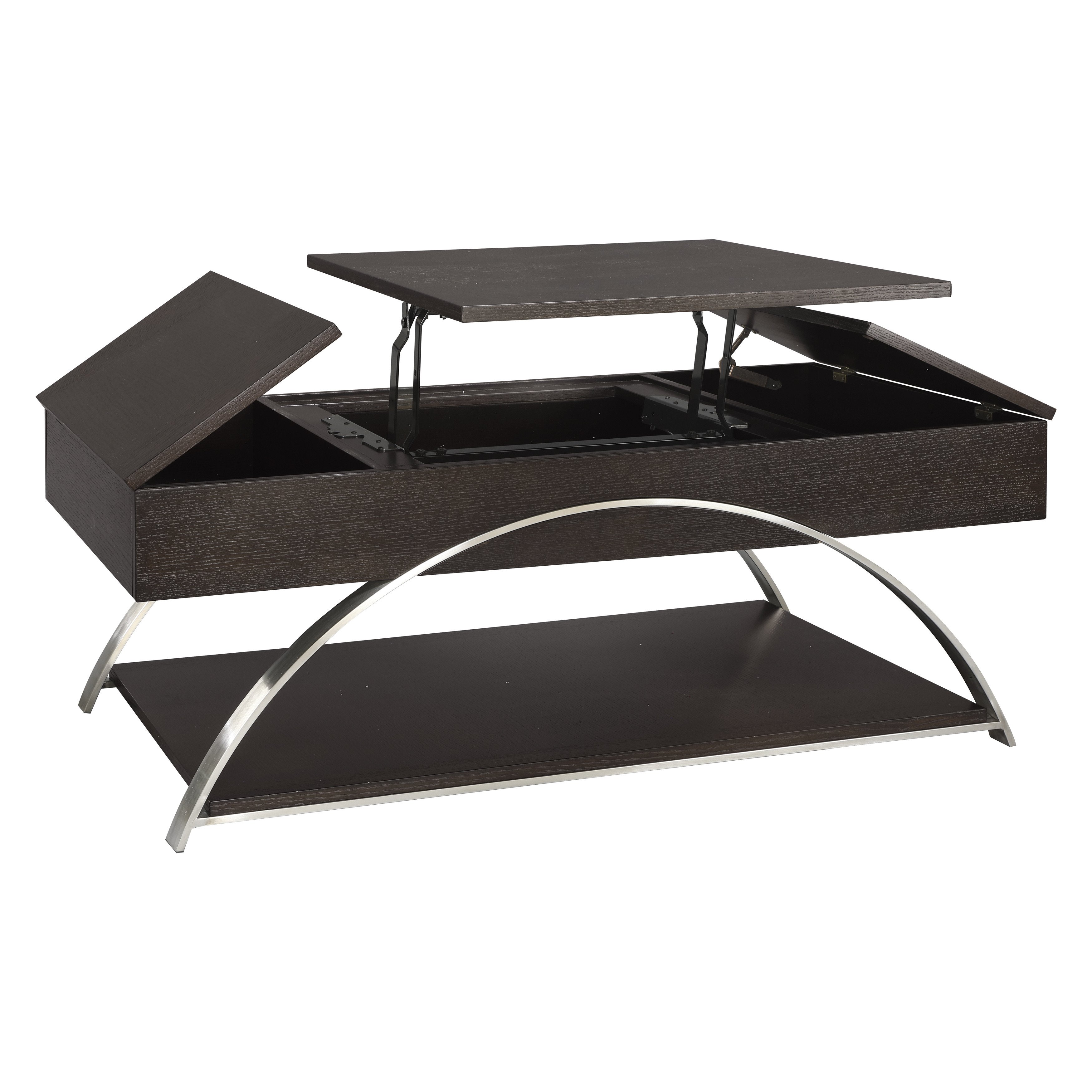 Description & DimensionsDesigned for the modern home, the Tioga Collection will provide a unique look for your living room. Brushed chrome geometric support legs provide a distinct contrast to the espresso finish of the cocktail table's top and display shelf. The functionality of the cocktail table is further enhanced by the lift mechanism that allows for the extension of the table's top. Coordinating end table, desk and entertainment unit are also available.PRODUCT DIMENSIONS: Overall Dimension: 47.75" x 26" x 18"HStorage interior: 40.75" x 25.75" x 9.75 "(1); 23.25" x 20.5" x 5.25" (1); 10.75" x 20.5" x 5.25" (2)Listing Includes: One Coffee Table Only.End Table: Not included.Simple Assembly Require.