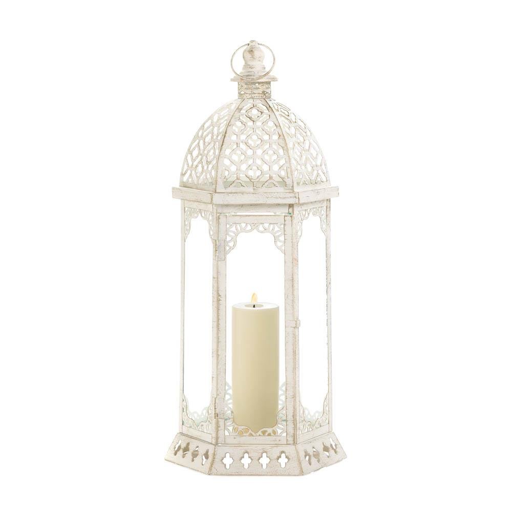 • Turn candlelight into a grand affair with this glorious iron candle lantern. Its vintage white finish is the perfect complement to its embellished cutouts and flourishes, and the clear glass panels are the perfect way to showcase your favorite candle.