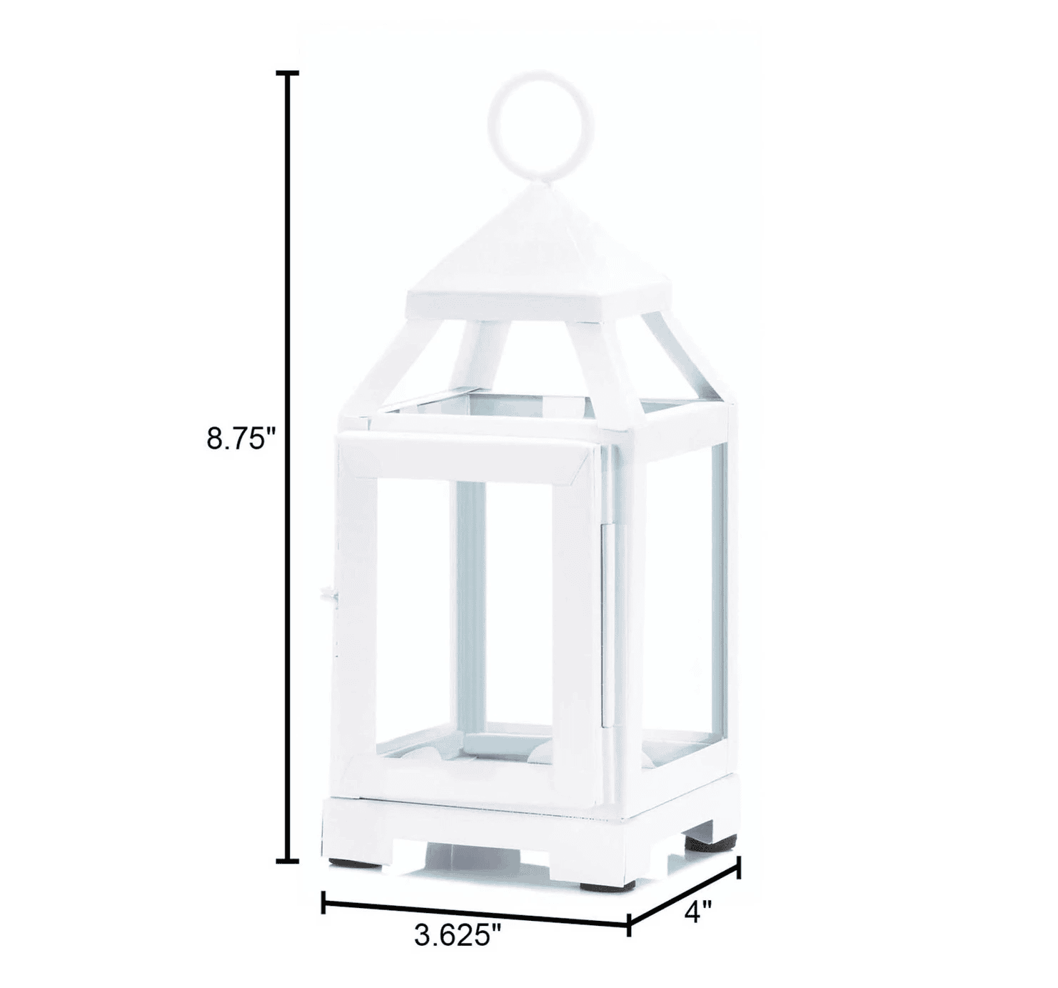 • Add some light to your small space with this cool little lantern! The metal framework is sleek and contemporary with its angular lines and white finish. The clear glass panels allow the shimmering light from a little candle shine bright.