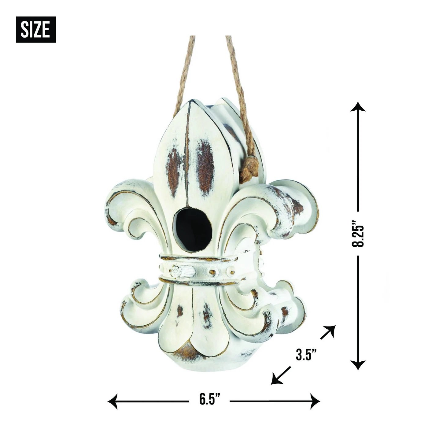 • Here's a stylish European-styled home for the birds! This unique birdhouse looks like a regal fleur-de-lis ornament with a weathered white finish and a linen rope for hanging.