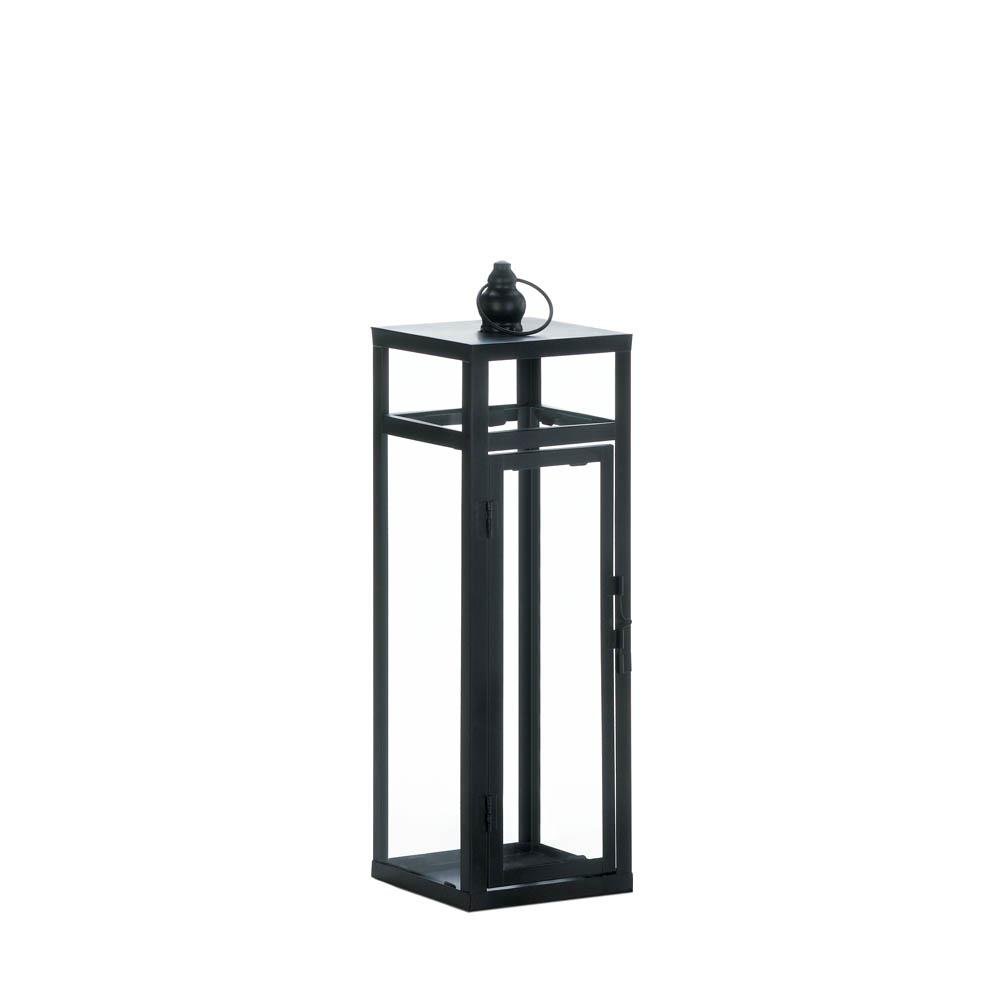 Don't let your favorite candle spend its time in an average candle lantern! This incredibly dramatic black metal lantern features a crisp, geometric design and clear glass to show off the shimmering candlelight. Weight 3.2 pounds. 5" x 5" x 17". Height w/loop; 18 1/2". Iron, Glass. UPC Number: 849179035419.
