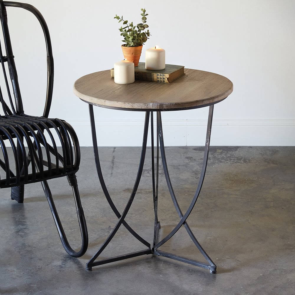 This graceful side table is perfect for any style home. It is made out of metal and has a wood tabletop.
