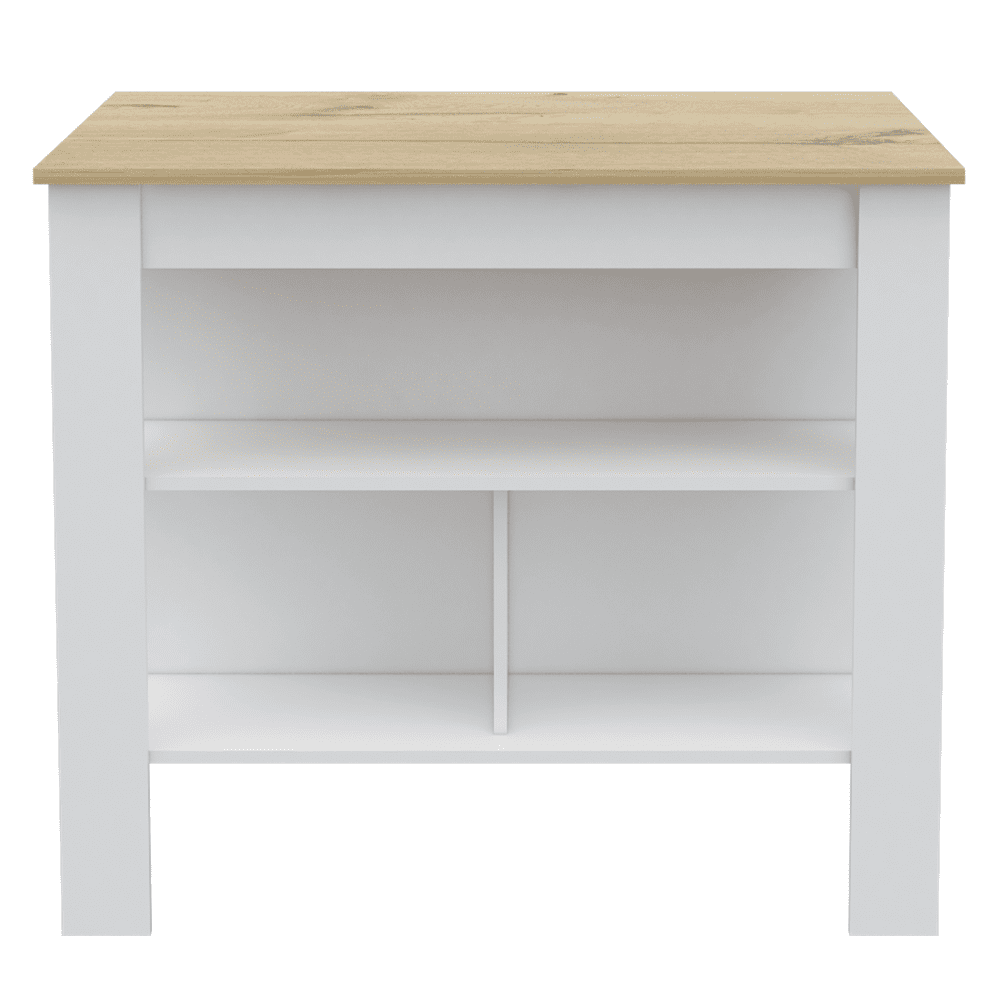 Romance CopyLooking for a kitchen set that will make your kitchen the envy of all your friends and family? Here's the Sierra Kitchen Set! This stylish set is designed with an exclusive white-light oak manufactured wood finish, making it a truly unique addition to any home. The stylish island is perfect for any kitchen, with a large top surface perfect for meal prep or entertaining. The white-light oak finish is easy to care for and will make your kitchen look its best. The modern style impresses your guests, and the three spacious lower shelves provide plenty of storage space. The Wall Cabinet is simply exquisite. It's practical, fits easily on any wall, and is easy to assemble. It features two double-door cabinets - one with an internal shelf and the other including two excellent racks, ideal for your dishes or glasses. And in the middle of the cabinet is an open shelf that adds a unique touch. Such a perfect way to add organization and elegance to your home.Product DetailsSet includesOne (1) kitchen island and one (1) wall cabinetFinish colorWhite, Light OakMaterialsManufactured woodKitchen Island dimensions35.4"H x 40.5"W x 27.5"DWall Cabinet dimensions23.6"H x 59.05"W x 12.4"DNumber of doors4Number of shelves7