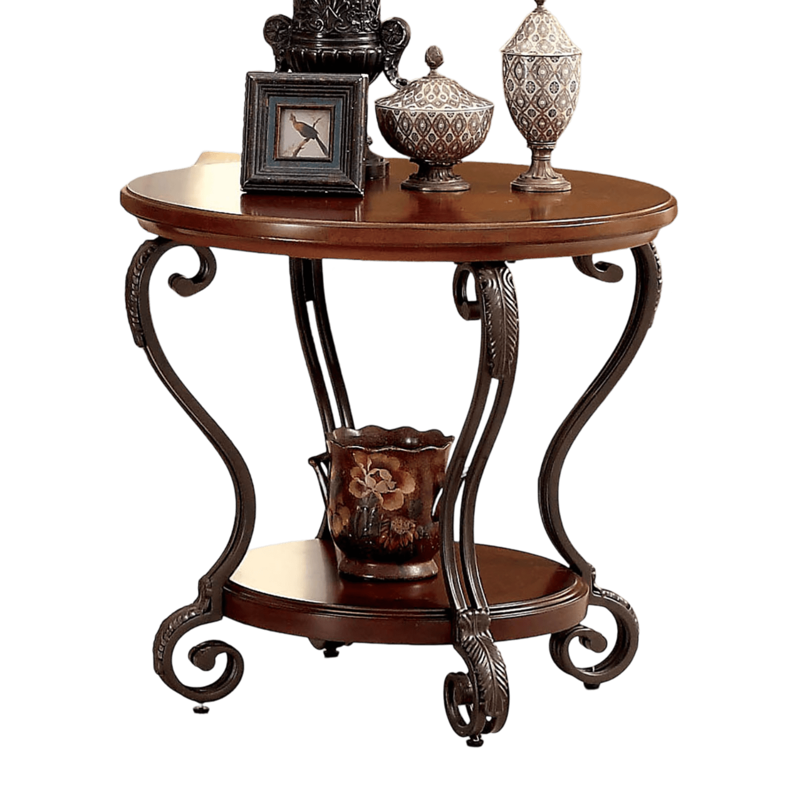 Product DescriptionDescription:-The ornate designs supporting and decorating each accent table will surely update any living space. Scroll detailing found along the metal legs creates a sophisticated appeal, drawing attention to the open shelves below.Listing includes - 1pc End Table only.Coffee Table And Sofa Table are Not Included.Dimensions-1x Sofa Table - 28"L X 28"W X 26 1/2"HFeatures :-Traditional StyleBrown CherryMetal, WoodOrnate DesignScroll Detail LegsSimple Assembly Required.
