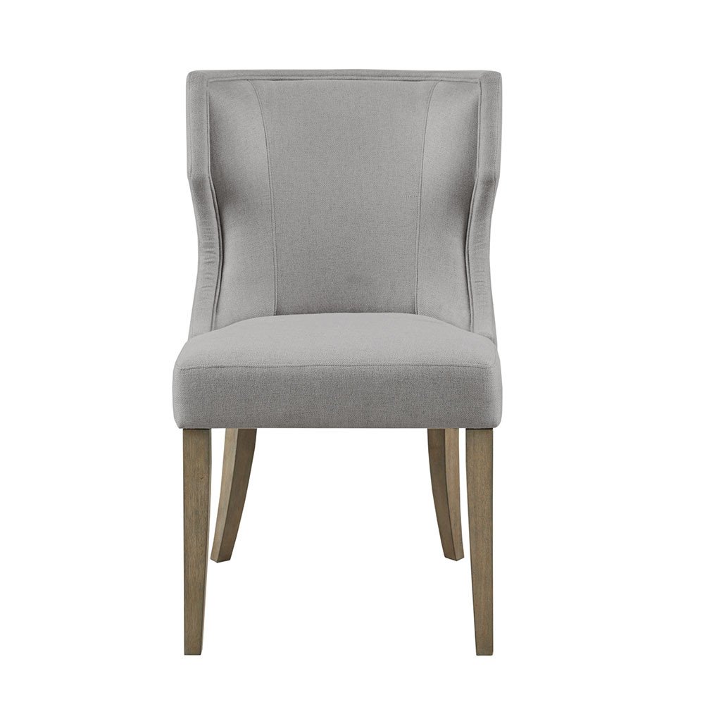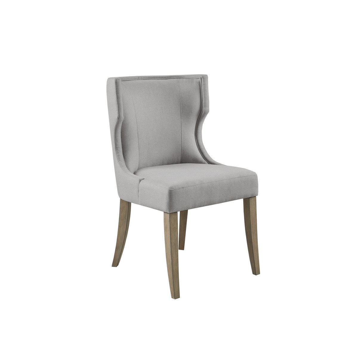 DescriptionDefine your dining room with the elegance of the Madison Park Carson dining chair. This upholstered dining chair features a wingback style back with piping details around the frame that create clean lines and curves, for a sophisticated silhouette. Solid wood legs, in a smooth distressed grey finish, complement the beautiful upholstery to complete the transitional, yet contemporary look. Assembly is required and tools are included.Product DetailsSee below1 Dining Chair:23.25"W x 26.5"D x 37.25"HSeat Dimension:22"W x 18.5"D x 20"HBack Rest Size:21.75"W x 17.25"HMaterialFrame Composition: Solid wood and plywoodLeg Material: Solid woodFabric Composition: 100% polyesterFilling: FoamWood Finish: Reclaimed grey smooth